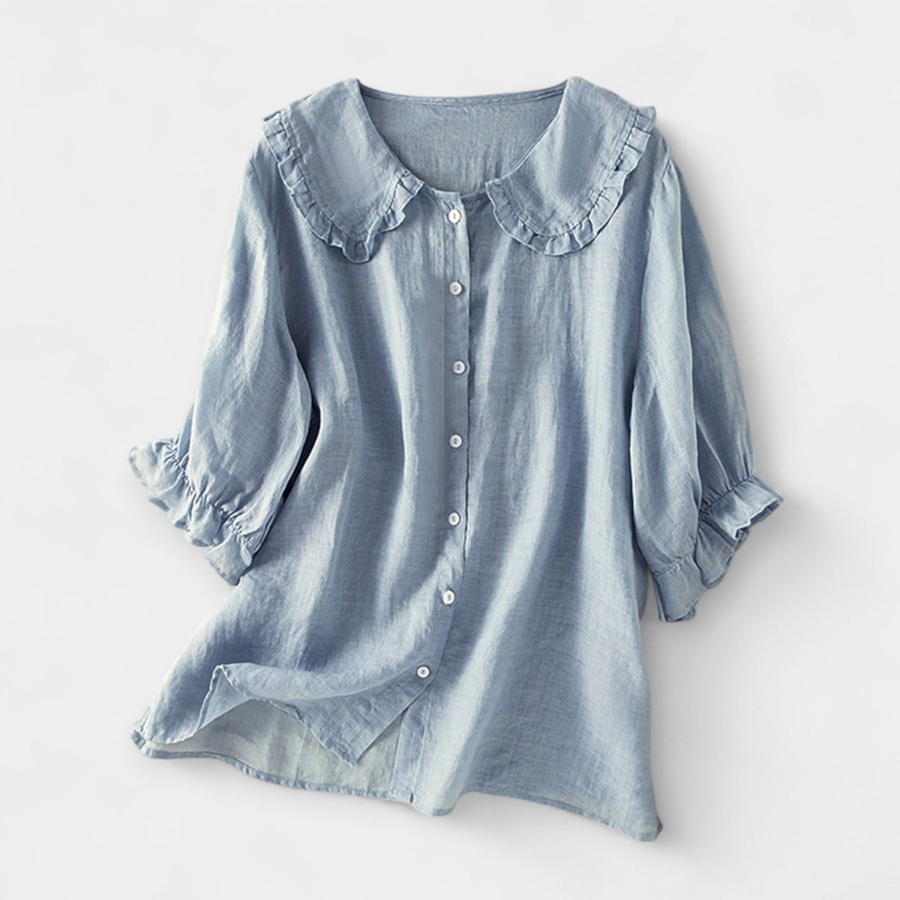 A playful shirt made from a lightweight blend of cotton and linen that combines elegance and comfort. The Peter Pan collar with ruffles adds a unique detail that elevates any casual look, perfect for skirts or trousers.