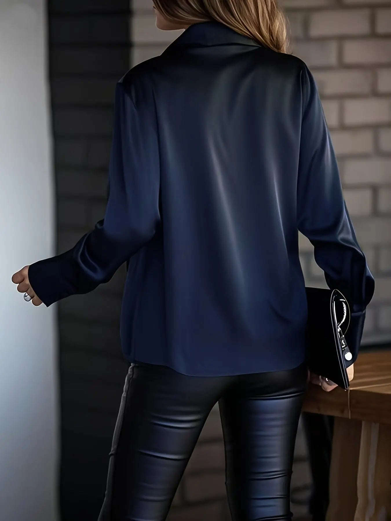 The Luxe Satin Wrap Blouse combines timeless elegance with modern sophistication. Featuring a deep V-neckline and a fluid drape, this piece effortlessly elevates any outfit for a polished, confident look.