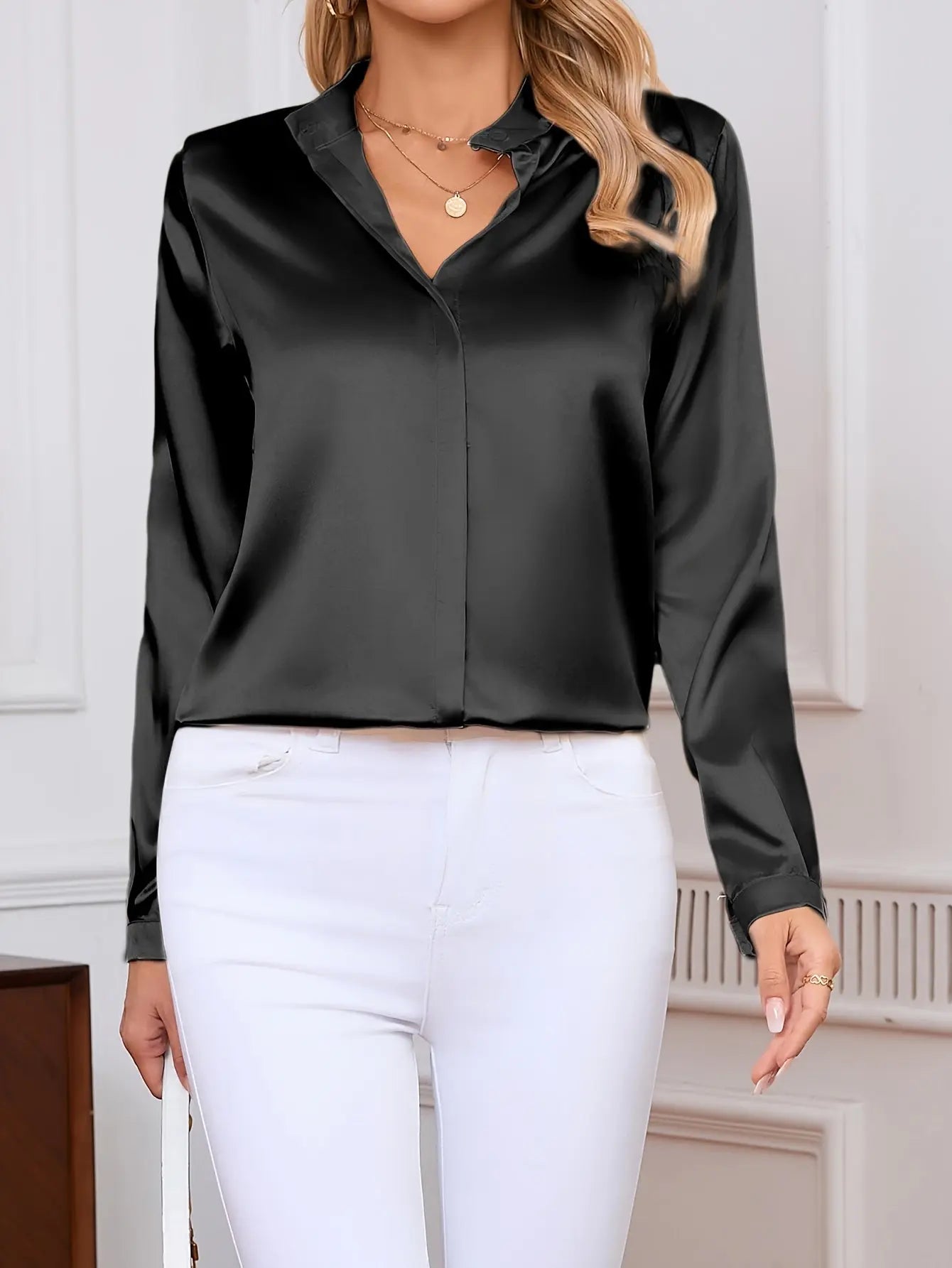 The Satin Charm V-Neck Blouse offers a sleek and luxurious feel, making it the perfect choice for both formal events and casual chic outings. Its soft satin finish and elegant drape add an instant touch of sophistication to your look.