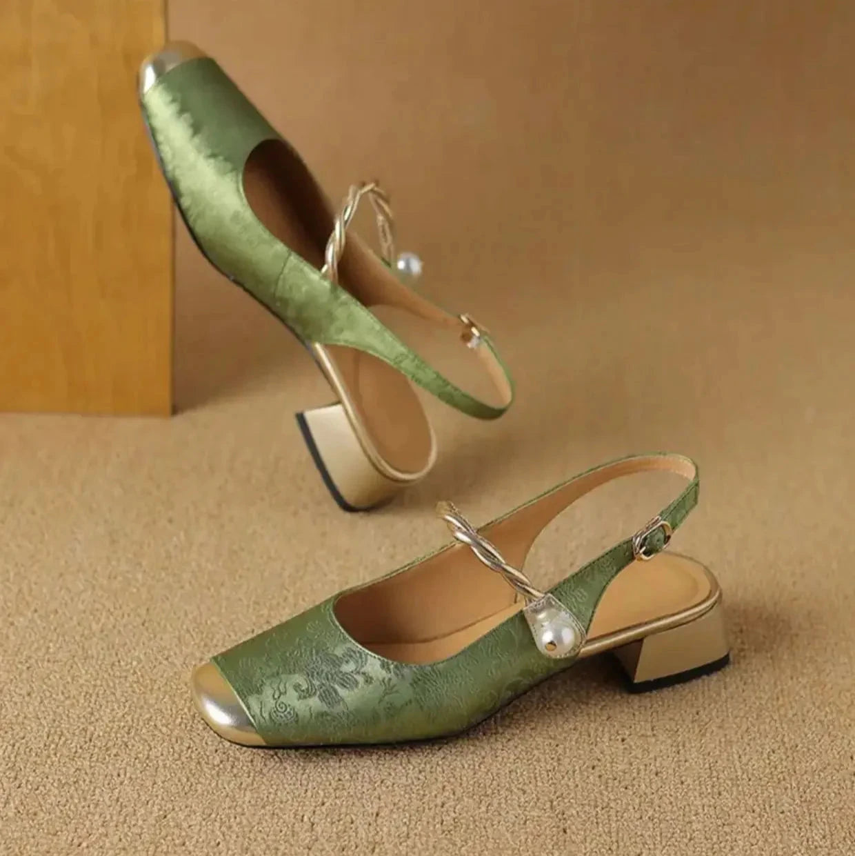 A romantic vintage-inspired silhouette defines these slingbacks, adorned with a twisted pearl strap and a sculpted low heel, perfect for elevating any outfit.