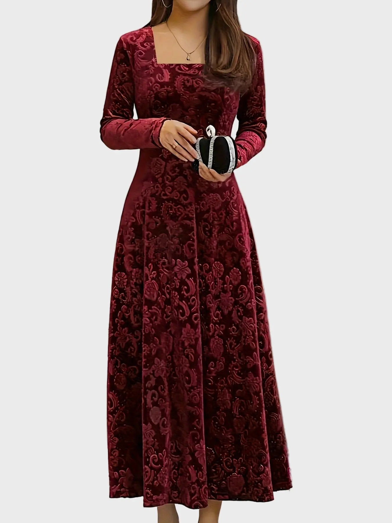 This luxurious velvet maxi dress offers a perfect balance of sophistication and timeless charm. Featuring a square neckline, long sleeves, and an intricate embossed floral pattern, it’s ideal for evening events and special occasions where elegance is a must.