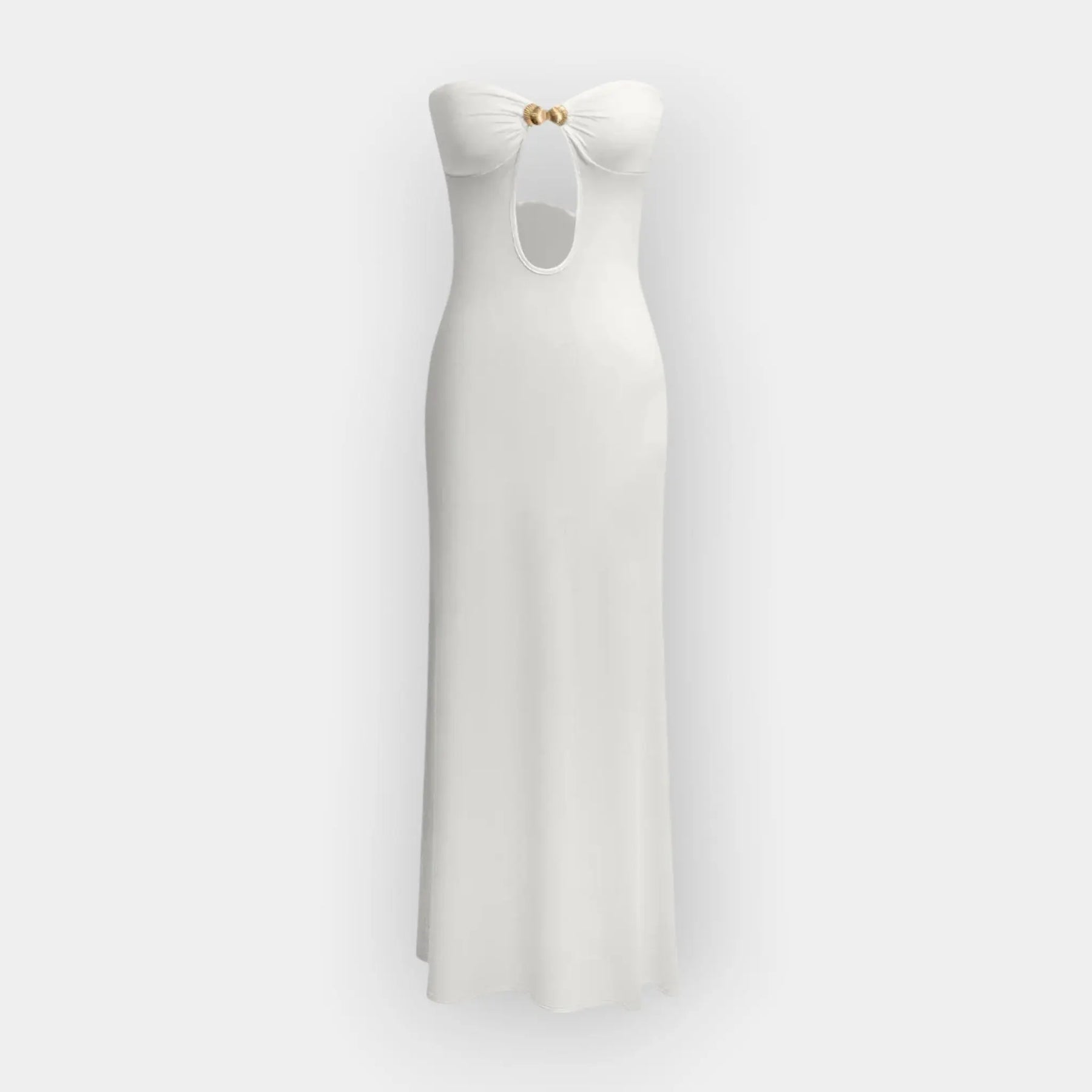 Elegant and airy, this strapless dress highlights femininity with subtle finesse. Ideal for sunny days and summer evenings with style and comfort.