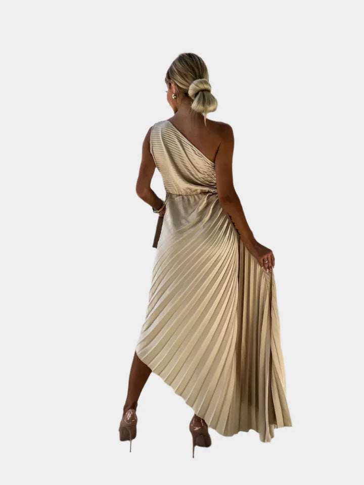 It is a statement of style and grace. With its asymmetrical line, the pleated skirt, and the three-dimensional floral detail, it is the perfect choice for weddings, evening events, or elegant summer dinners. The light fabric caresses the silhouette in a refined way.