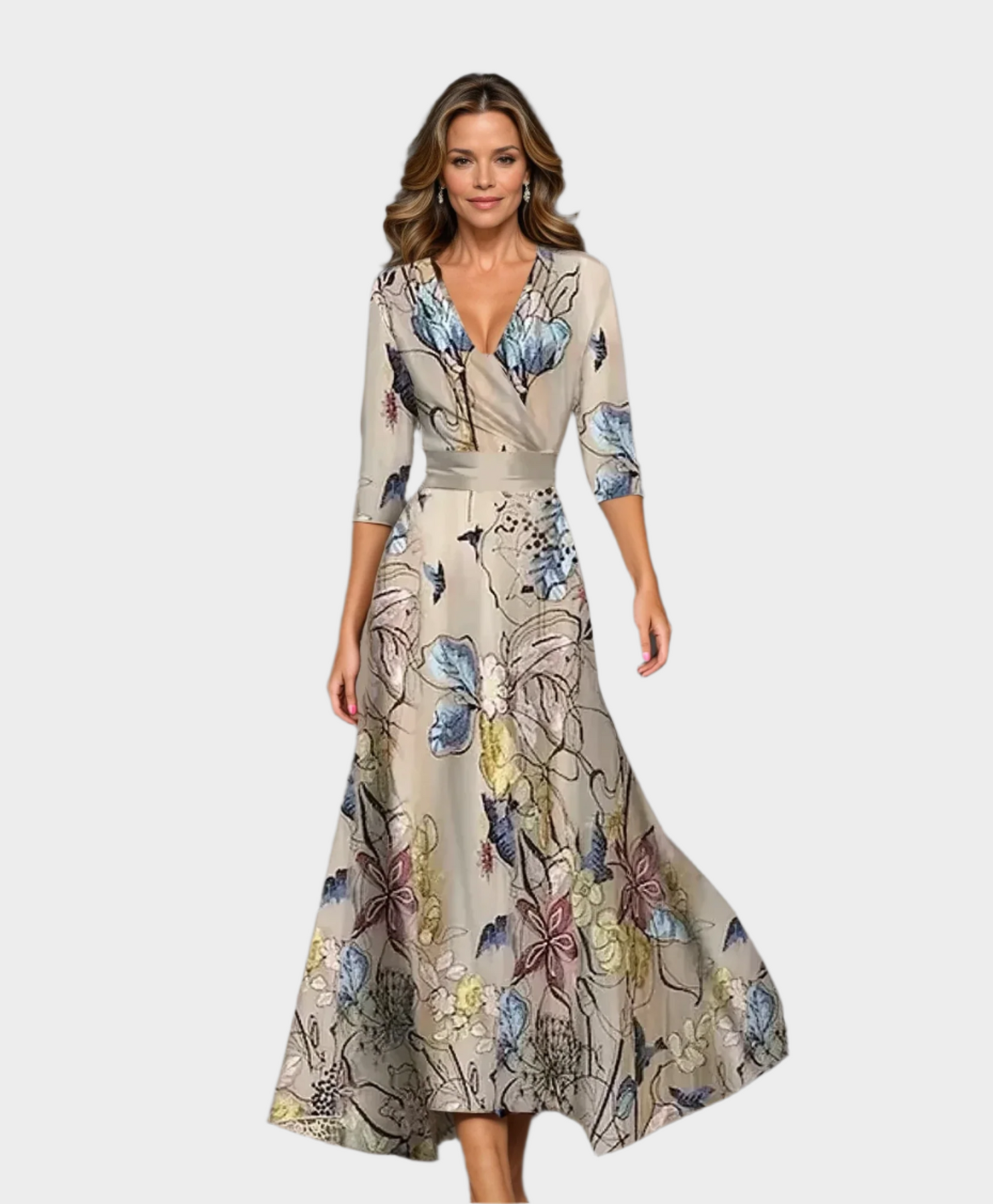 Discover its understated elegance. This midi dress features a V-neckline and three-quarter sleeves, combining finesse and comfort with a painted floral design that elegantly highlights the silhouette.