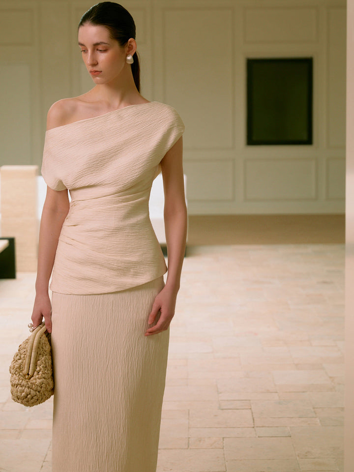 Asymmetrical Neck One Shoulder Off Pleated T-Shirt