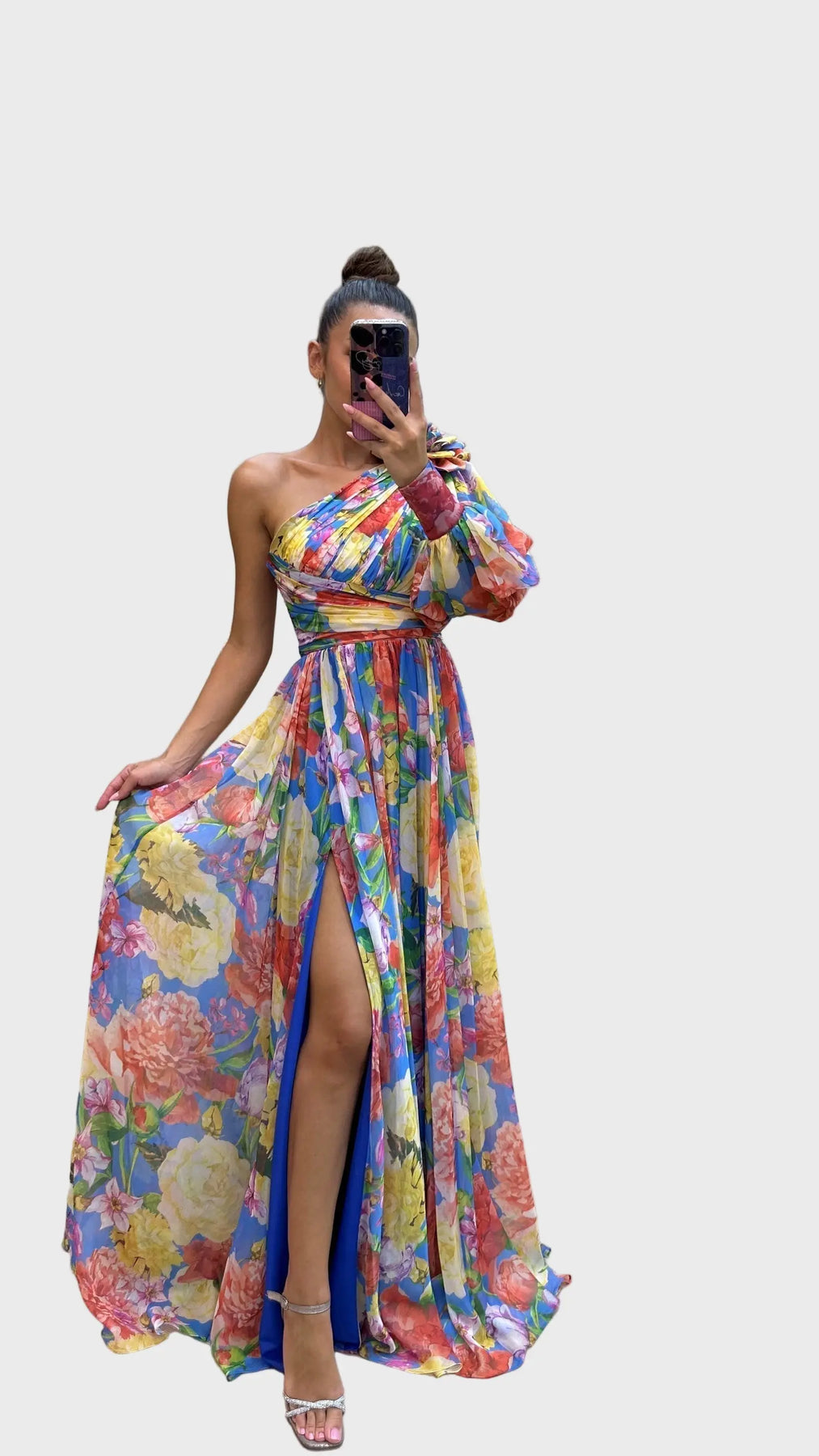 This vibrant one-shoulder maxi dress captures the essence of summer elegance with its bold floral print and flowing silhouette. Designed with a thigh-high slit and soft, lightweight fabric, it offers both sophistication and comfort for special occasions.