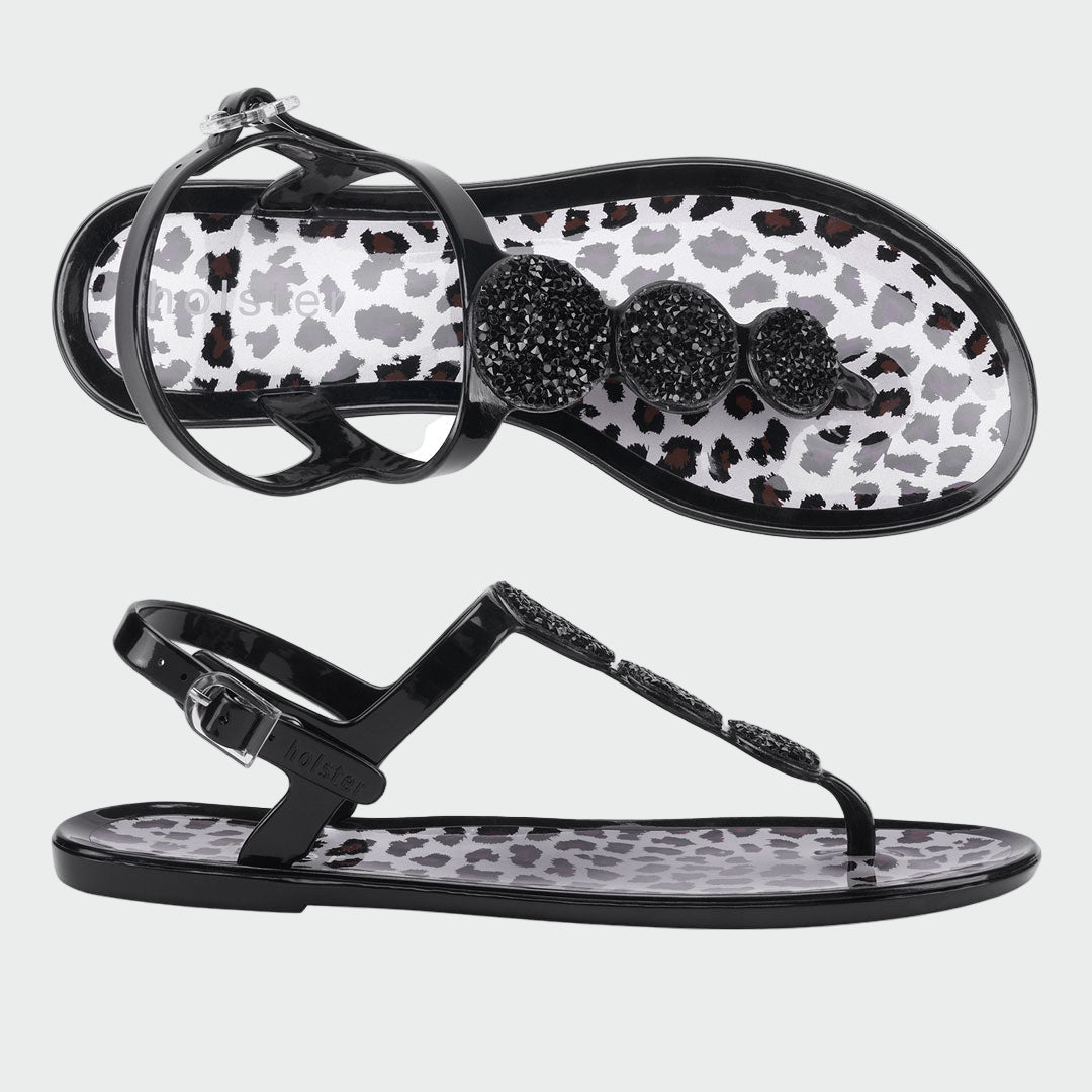 Unleash your bold style with the Luna Luxe Sandals in midnight black. Featuring crystal-like embellishments and a striking leopard-print footbed, these sandals are designed for women who love to stand out.