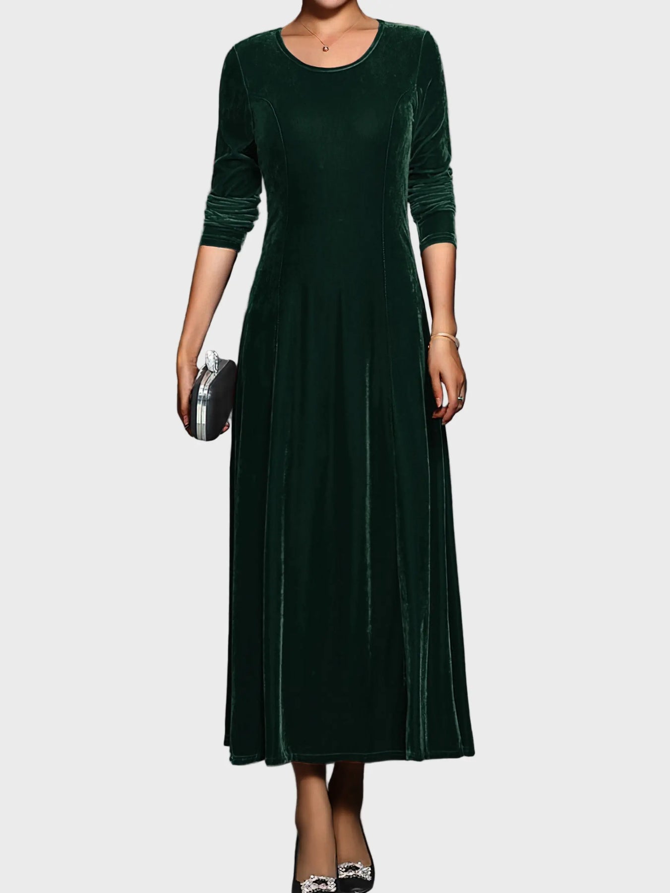 This luxurious velvet maxi dress combines timeless sophistication with effortless comfort. Designed in a rich royal blue hue, it features a classic round neckline, long sleeves, and a flowing A-line silhouette perfect for evening events and formal gatherings.
