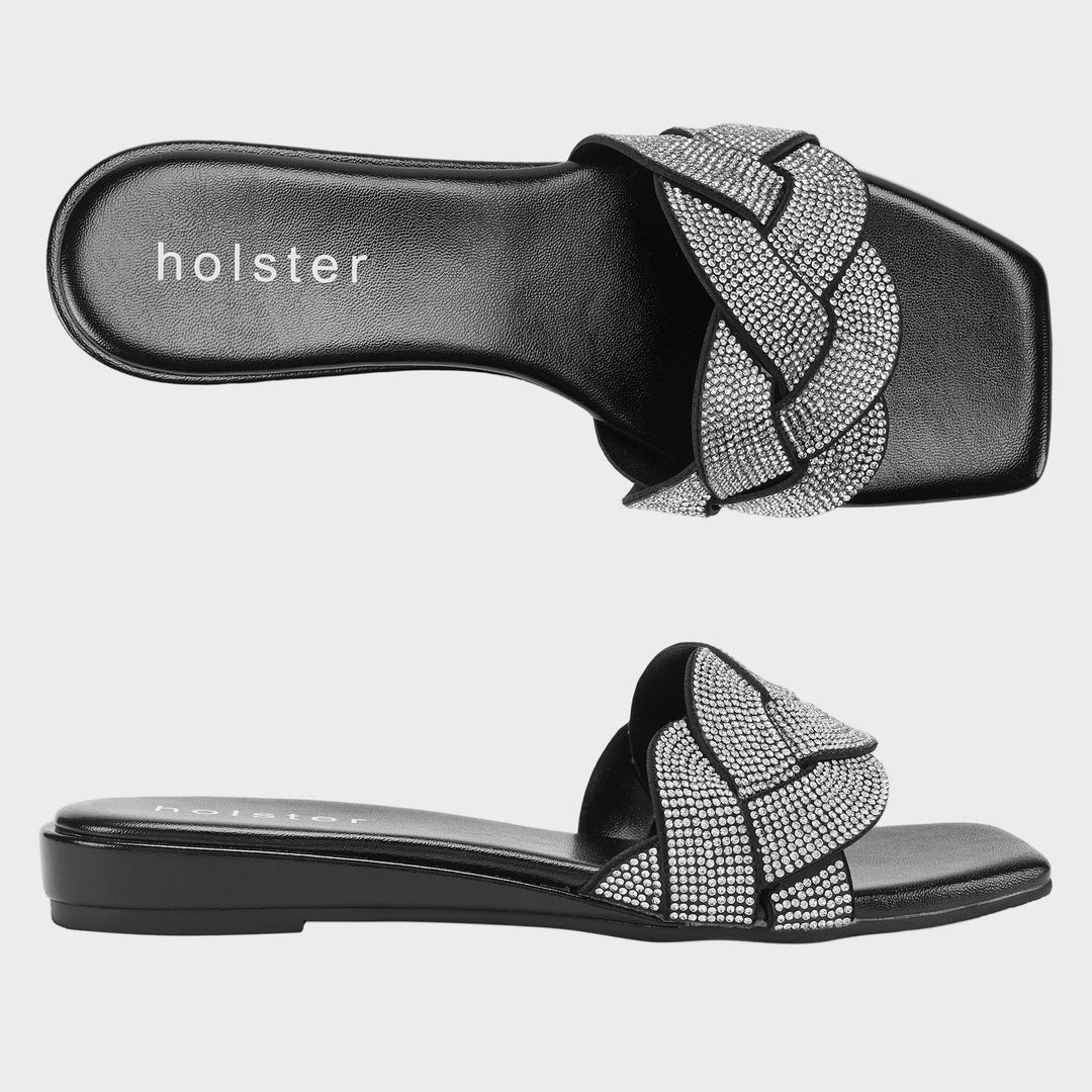 Step into refined glamour with the Serenya Noir Braided Shine Sandals. Featuring an intricately braided strap adorned with shimmering crystals, these sandals combine classic craftsmanship with modern sparkle.