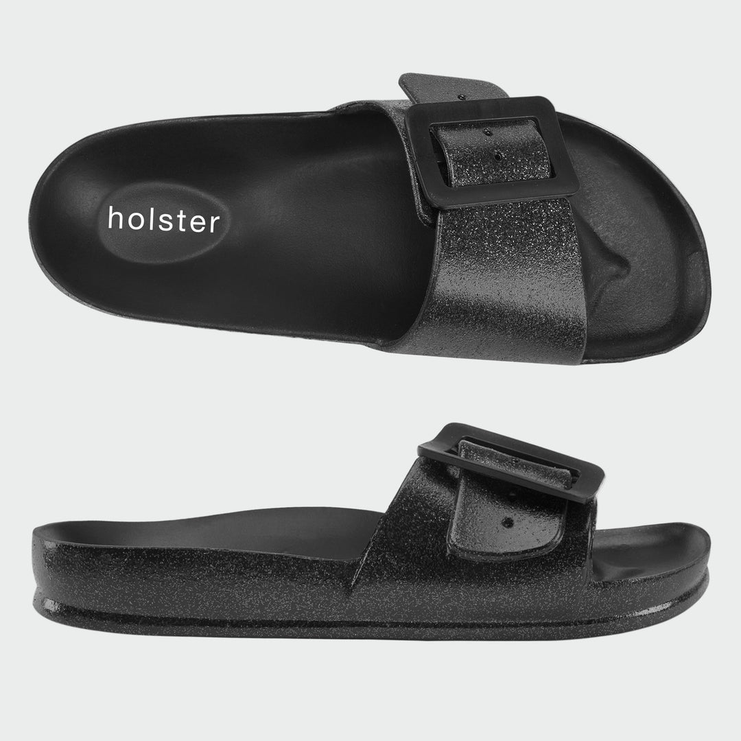 Bring a touch of sparkle to your style with the Solace Glitter Sandals in black glitter. Designed with shimmering straps and a timeless silhouette, these sandals combine versatile elegance with all-day comfort.