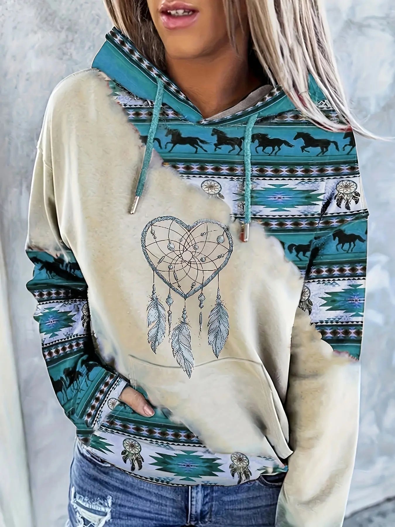 Wrap yourself in bohemian charm with the Dreamcatcher Spirit Hoodie. Featuring rich tribal patterns, galloping horse silhouettes, and a heart-shaped dreamcatcher design, this hoodie brings together comfort and artistic flair for your everyday adventures.