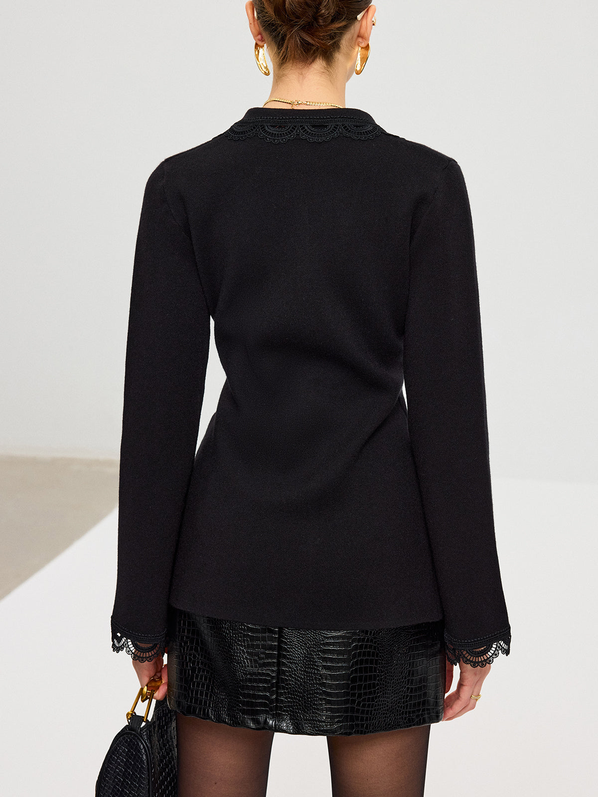 Wool Blend Lace Trim Metal Button Cardigan  Liora Lane Boutique Cardigans Black / XL 99.99