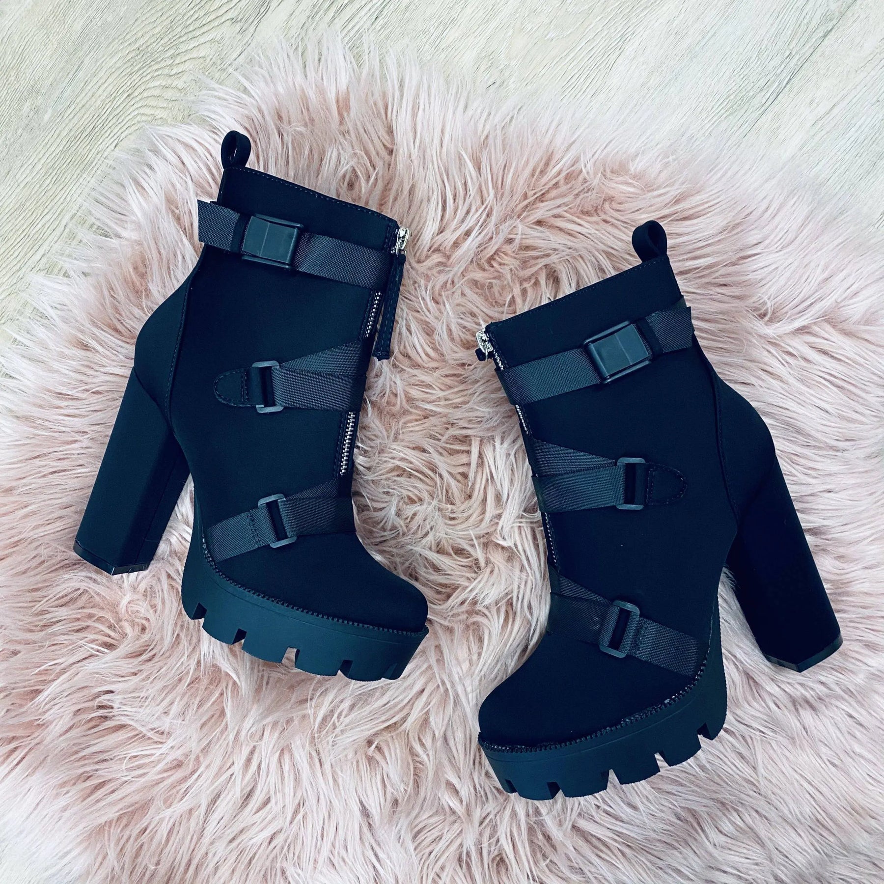 Command attention with the Eclipse Buckle Strap Platform Boots, a bold fusion of edgy design and elevated style. Featuring multiple buckle straps, a chunky platform sole, and a sleek high heel, these boots are made for making a statement.